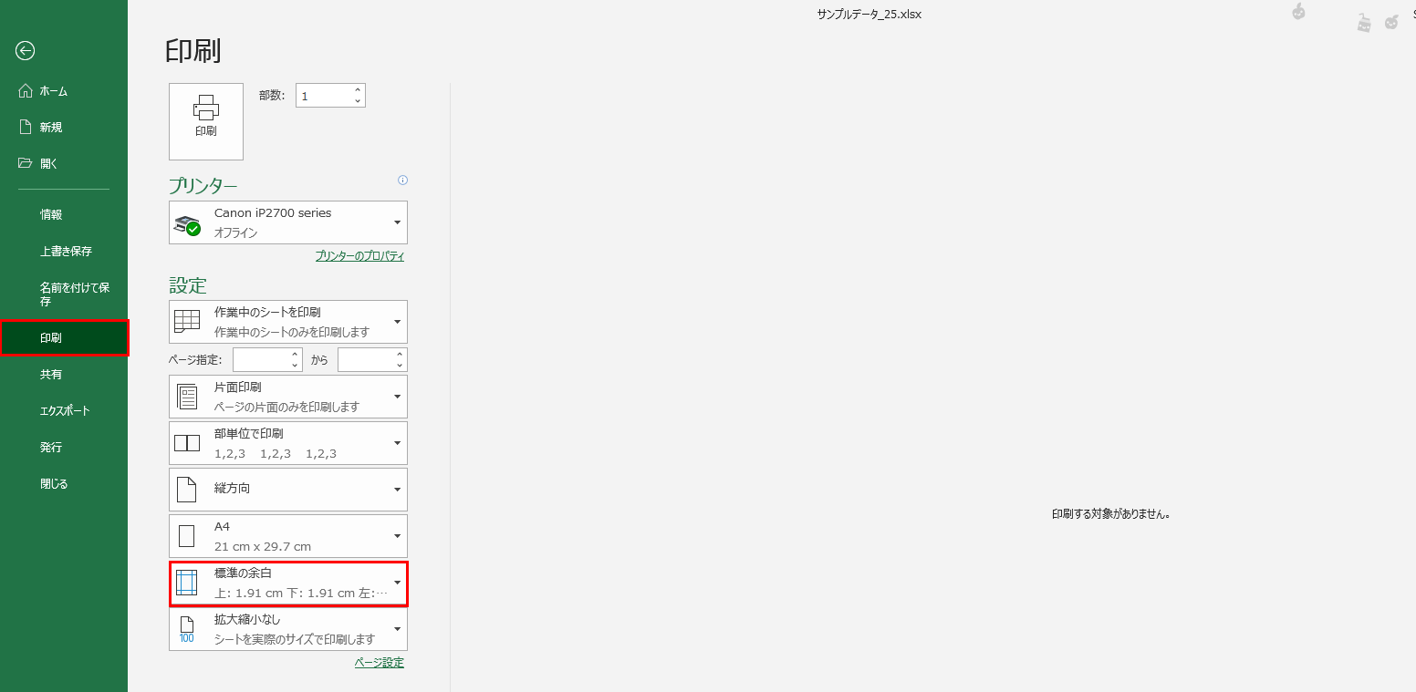 [ファイル] タブ からのほうが、印刷プレビューを確認しながら設定をすることができるので、こちらのほうがおすすめです。使いやすいほうを利用してください。