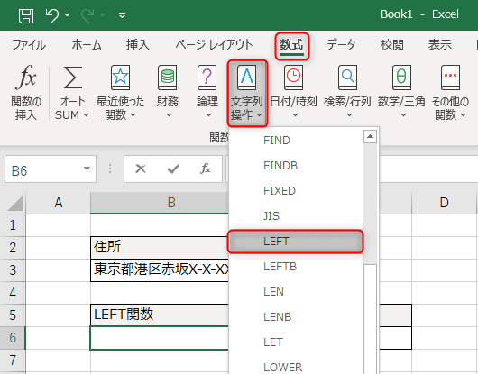 抜き出したいセルにアクティブセルを置いたら、[数式]タブ→[文字列操作]→[LEFT]と追っていきましょう。