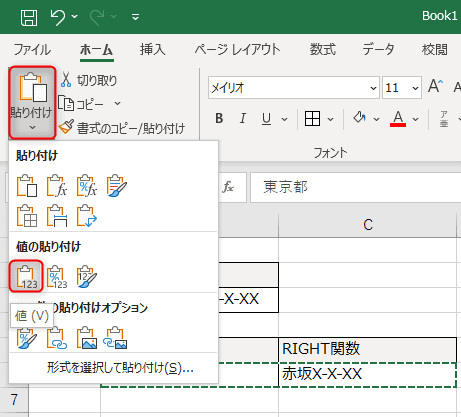 同じ要領で、隣のセルにRIGHT関数を使ってみましょう。「赤坂~」を抜いてみます。