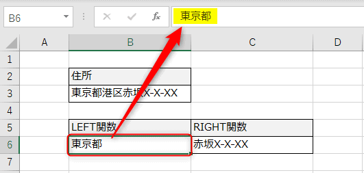 セルB3にある「東京都港区赤坂~」の文字列より、左から3文字分抜き出します。