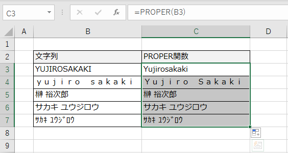 [char no=”4″ char=”さえちゃん3”]PROPER関数はローマ字入力されたデータを統一するときに使います。Webからの直接入力の場合、YUJIRO SAKAKI と大文字だけで登録してしまう人や、yujiro sakaki と小文字で登録してしまう人がいると、集まったデータが統一できません。PROPER関数は、すべてのデータを統一するという目的で使われることがほとんどです。[/char]