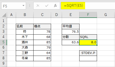 分散で説明したときのデータを使いましょう。セルE5には、VAR.P関数が入っています。