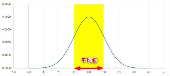 標準偏差を学習するときは、こちらの正規分布を思い描いてください。中心を平均値として前後の-1.0 +1.0 の範囲が、標準偏差の-1σ+1σの範囲になります。