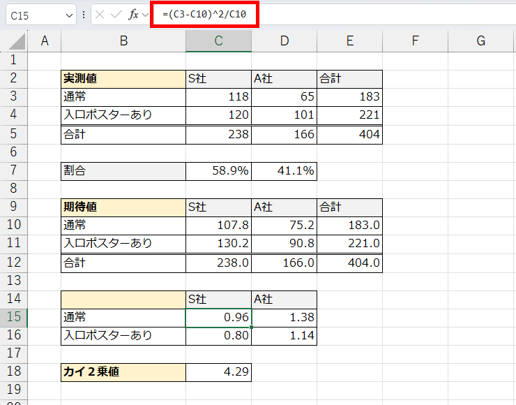 カイ2乗検定では、次の式で「カイ2乗値(χ²値)」を求めます。