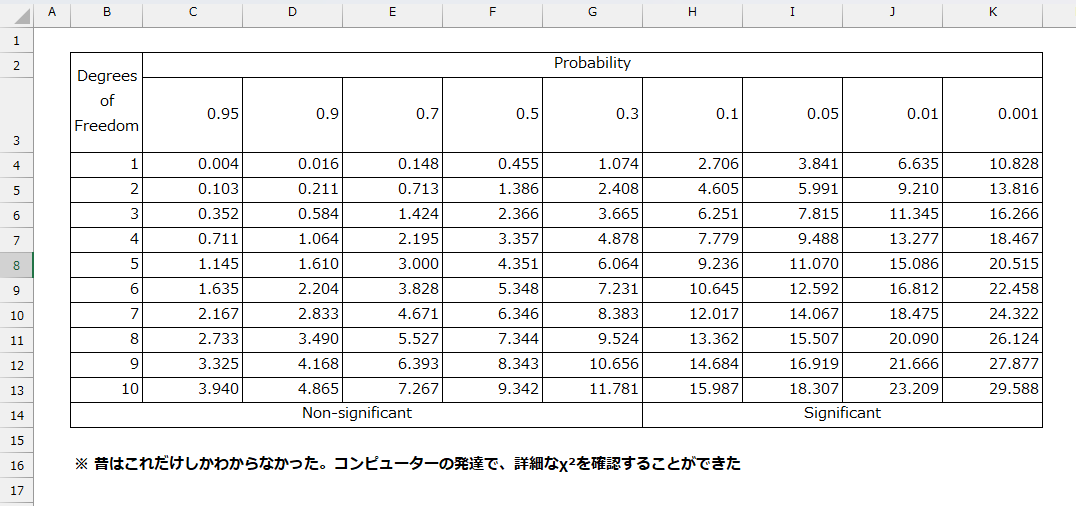 いまはコンピューターが全部やってくれる。現代の分析は言うまでもなく、カイ2乗分布表を手で探す必要はありません。