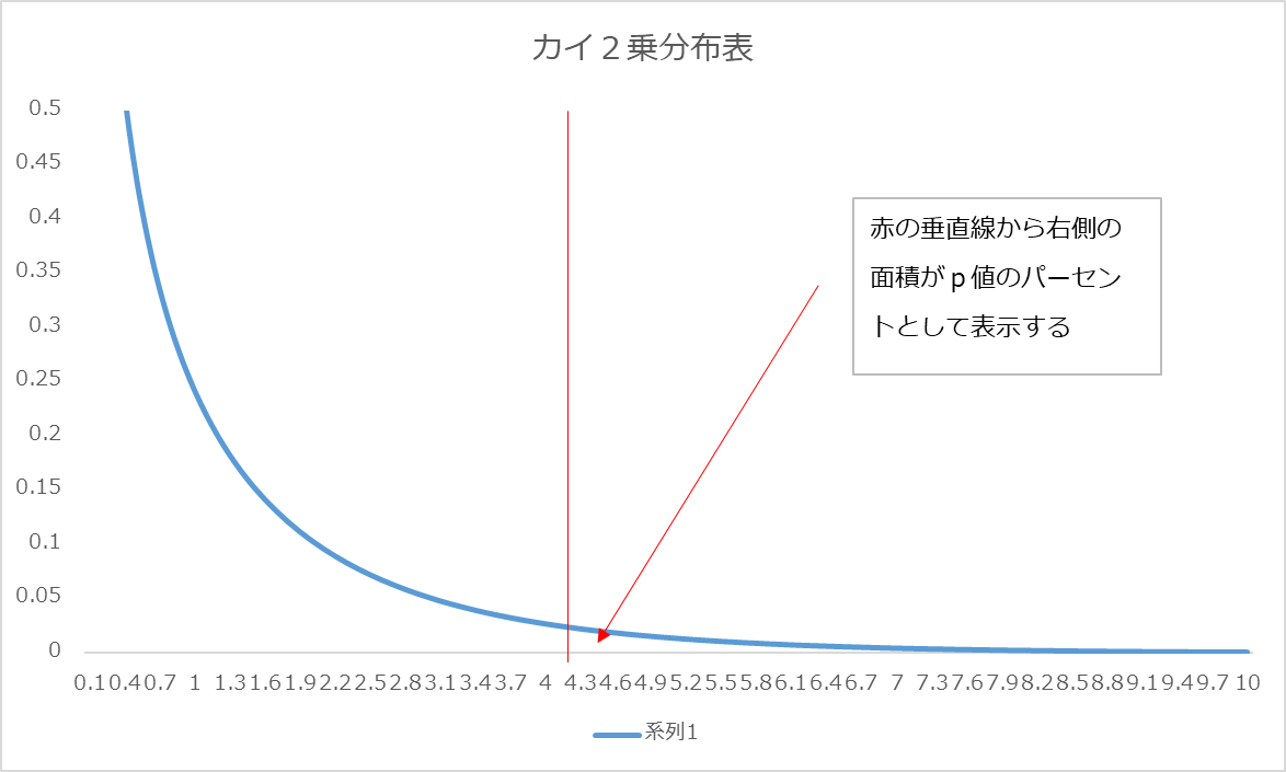 正規分布で1σの範囲が約68%の部分だよ、という説明を思い出していただければと思いますが、カイ2乗検定のp値は、自由度によって描かれたカイ2乗分布表の面積を求めているということになります。