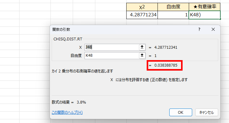CHISQ.TEST関数で求めたp値は「約3.8%」でした。