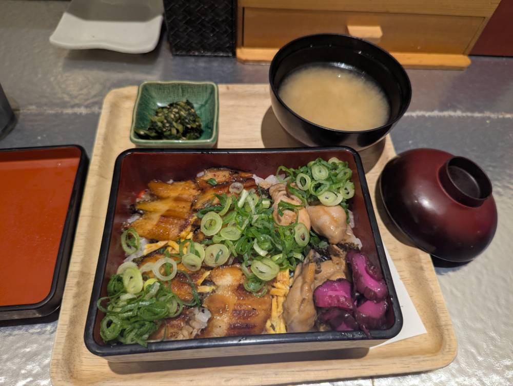初日は駅構内の海鮮屋さん。アナゴと牡蛎どんぶり! めちゃくちゃうまい!