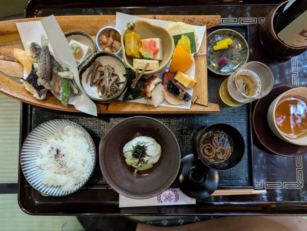 雨がこのあと降ってきたので、旅館の中での食事となりましたが、涼しい風、そして新鮮な空気に包まれて、贅沢な時間を堪能することができました。