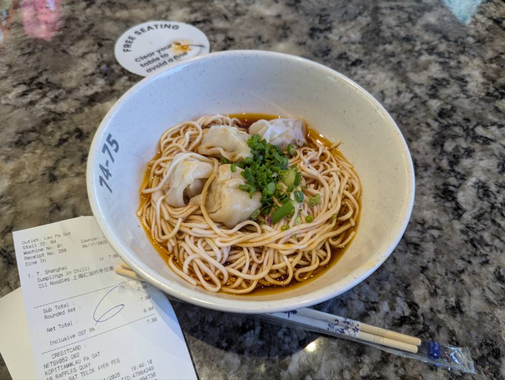 ワンタンのオイルヌードル、7ドル。初日の夜は、これくらいで十分でした。見た目は寂しいヌードルでしたけど、おいしかったよ。
