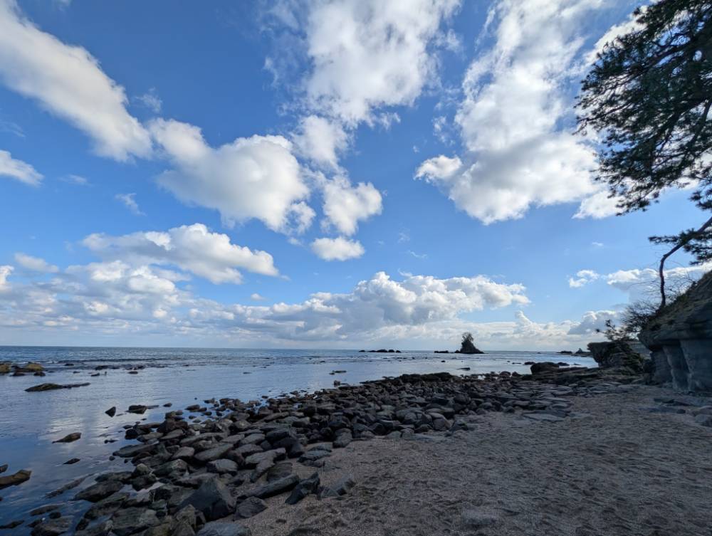 観光スポットでもある雨晴海岸(あまはらしかいがん)に向かいます。ここから立山連峰を眺められるのですが、水平線上に雲がかかって見れませんでした。